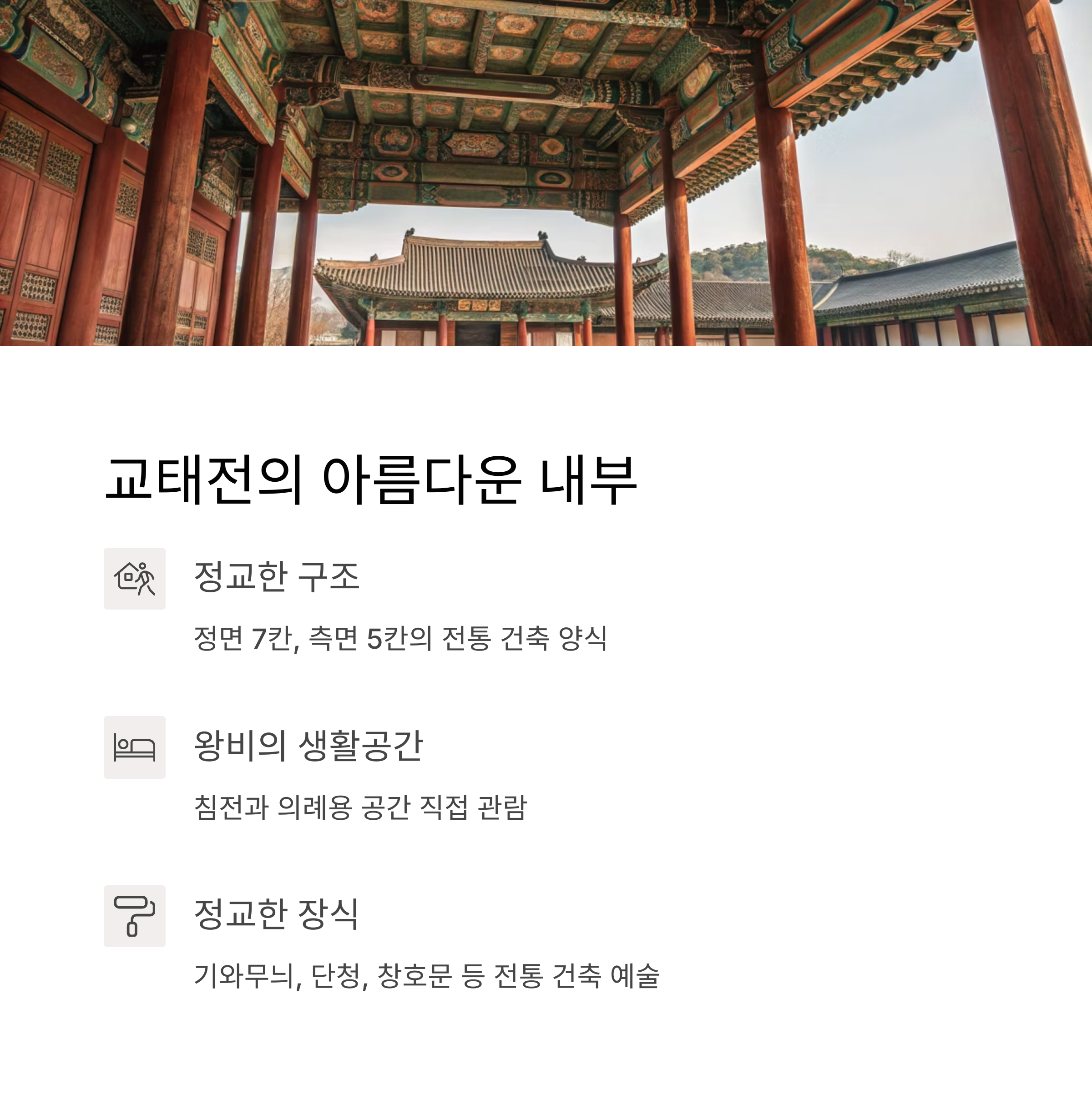 교태전 내부와 부속 공간들을 직접 관람할 수 있는 유일한 기회입니다.