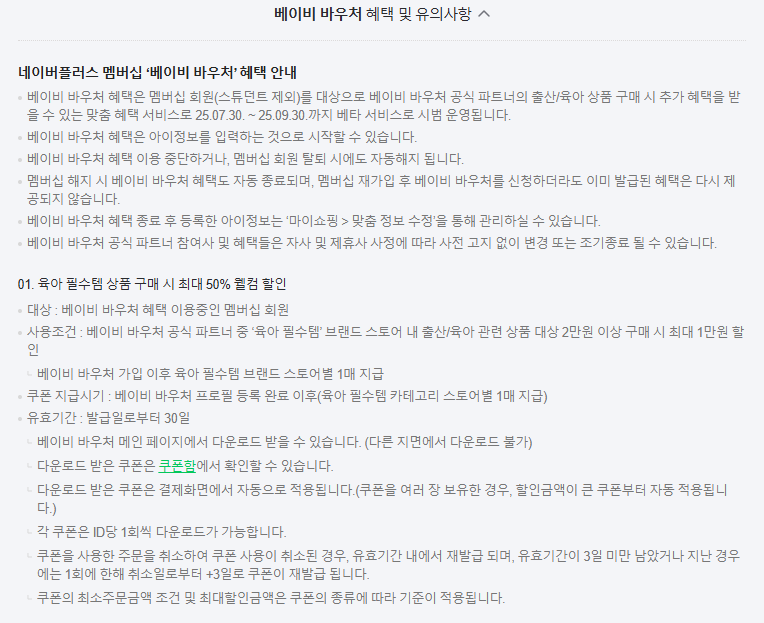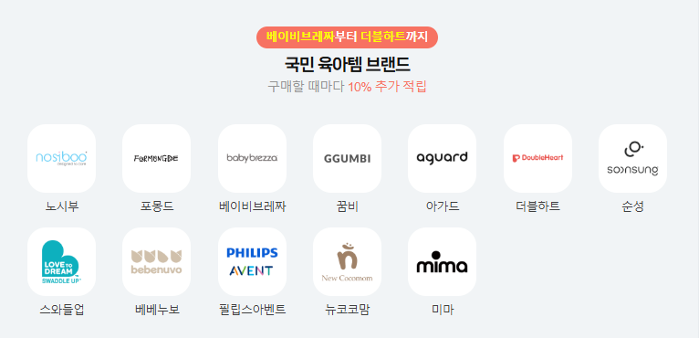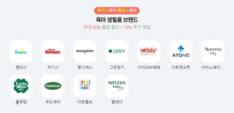 | 육아 생필품 50% 웰컴 할인 | 최대 1만 원 (2만 원 이상 구매 시, 브랜드당 1회) |