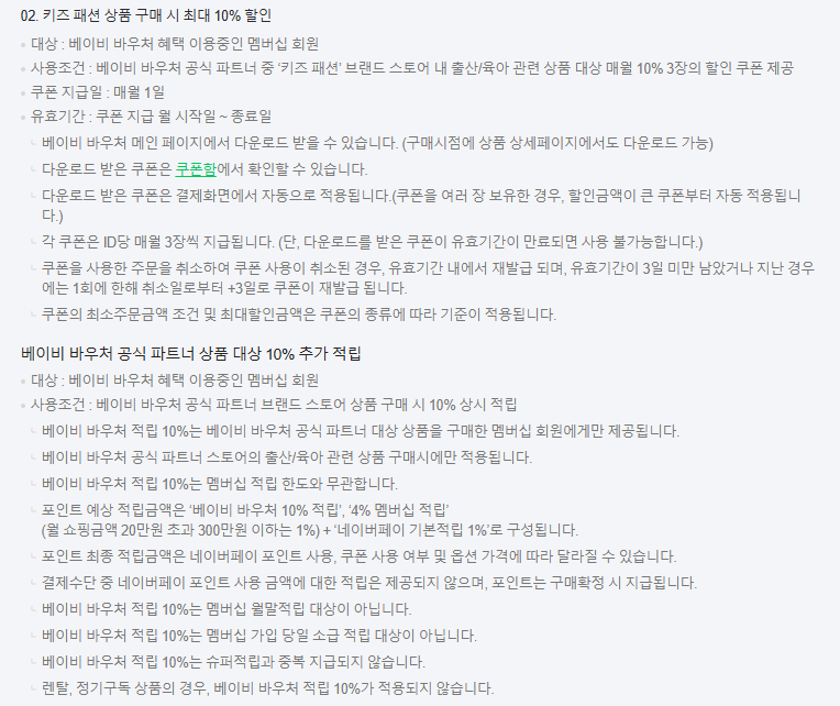 | 키즈 패션 할인 쿠폰 | 매월 10% 쿠폰 3장 (브랜드별 제공) |