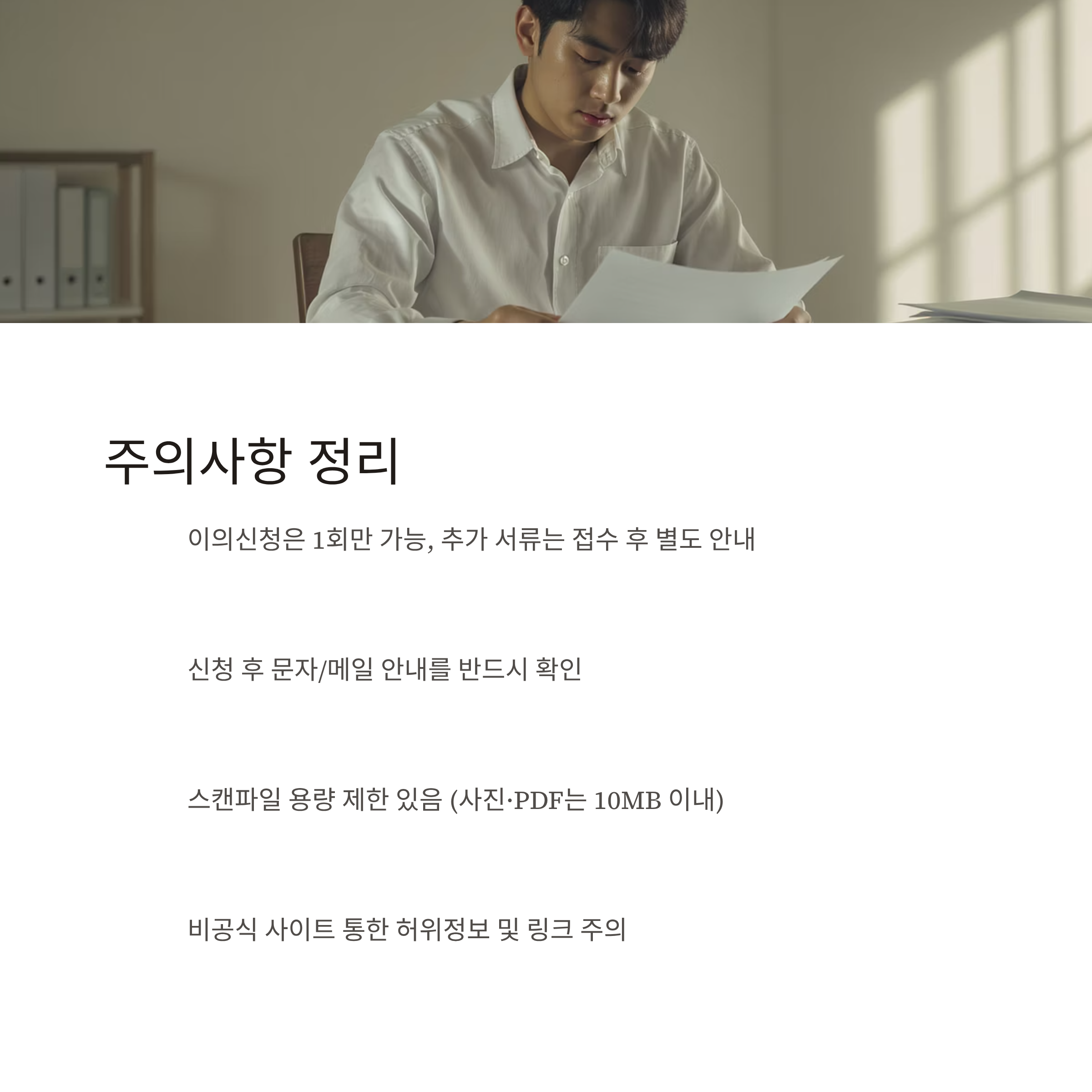 - 이의신청은 1회만 가능, 추가 서류는 접수 후 별도 안내