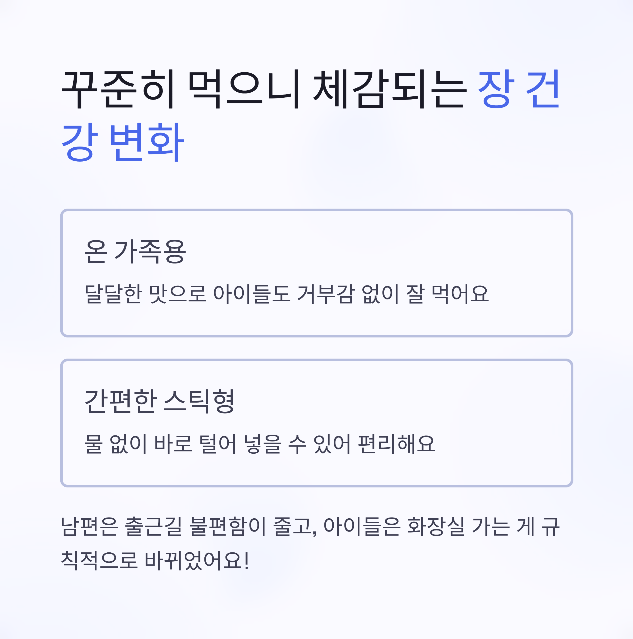 저희 남편은 예전엔 장이 예민해서 출근길에 불편할 때가 많았는데, 요즘은 아침마다 하나씩 챙겨 먹고 나가면서 훨씬 편해졌다고 해요. 아이들도 화장실 가는 게 한결 규칙적이 됐고, 저 역시 속이 더부룩하거나 가스 차는 게 줄어들었어요.