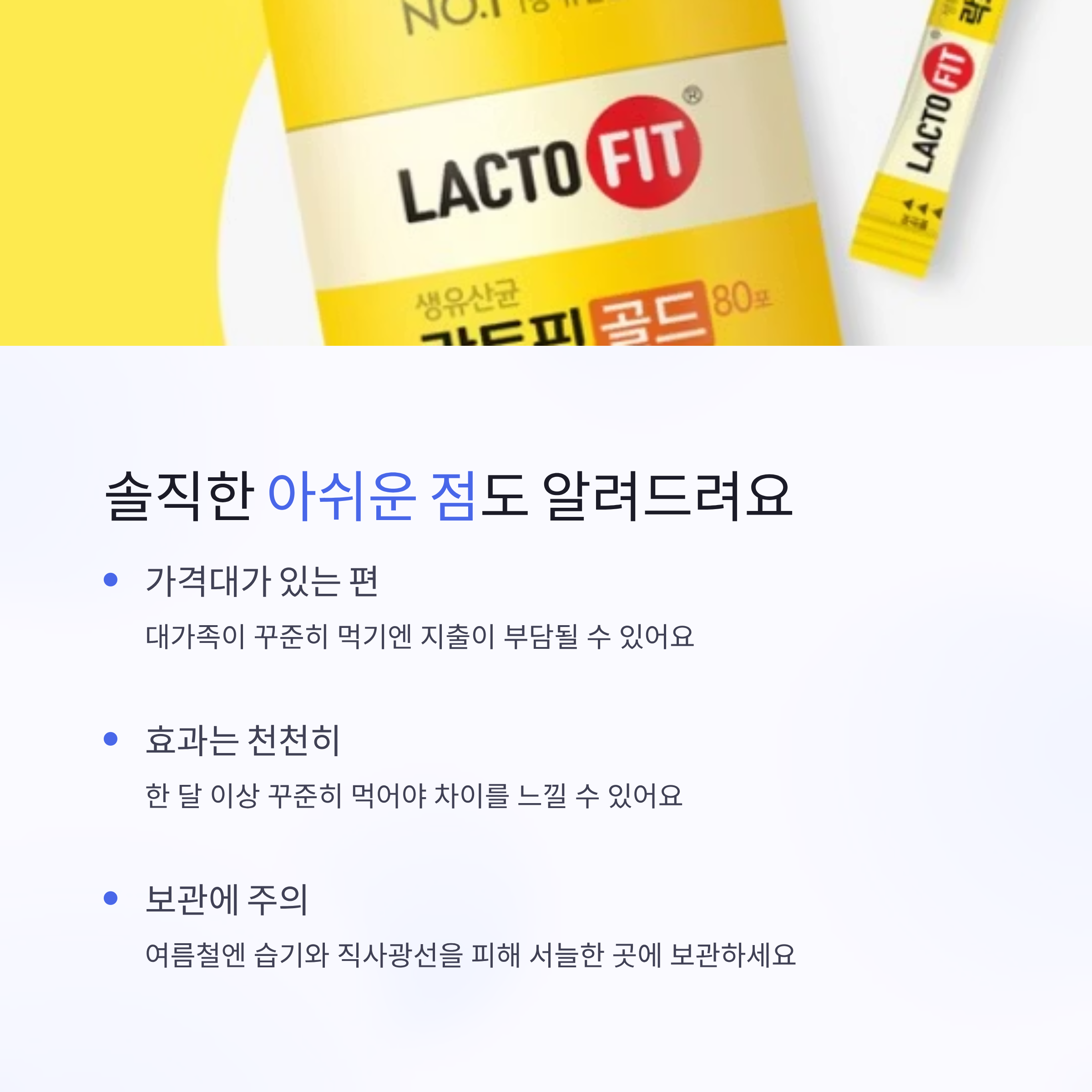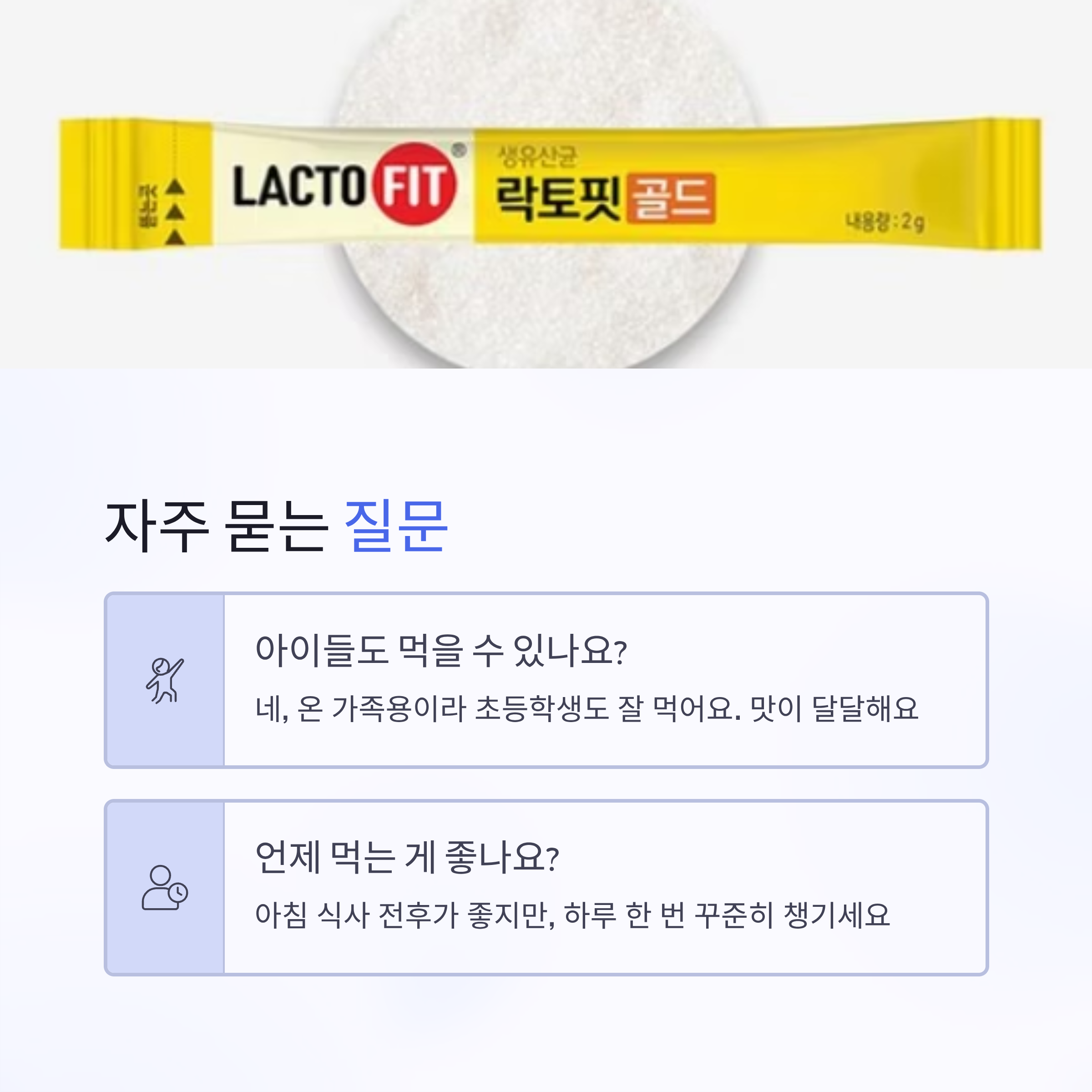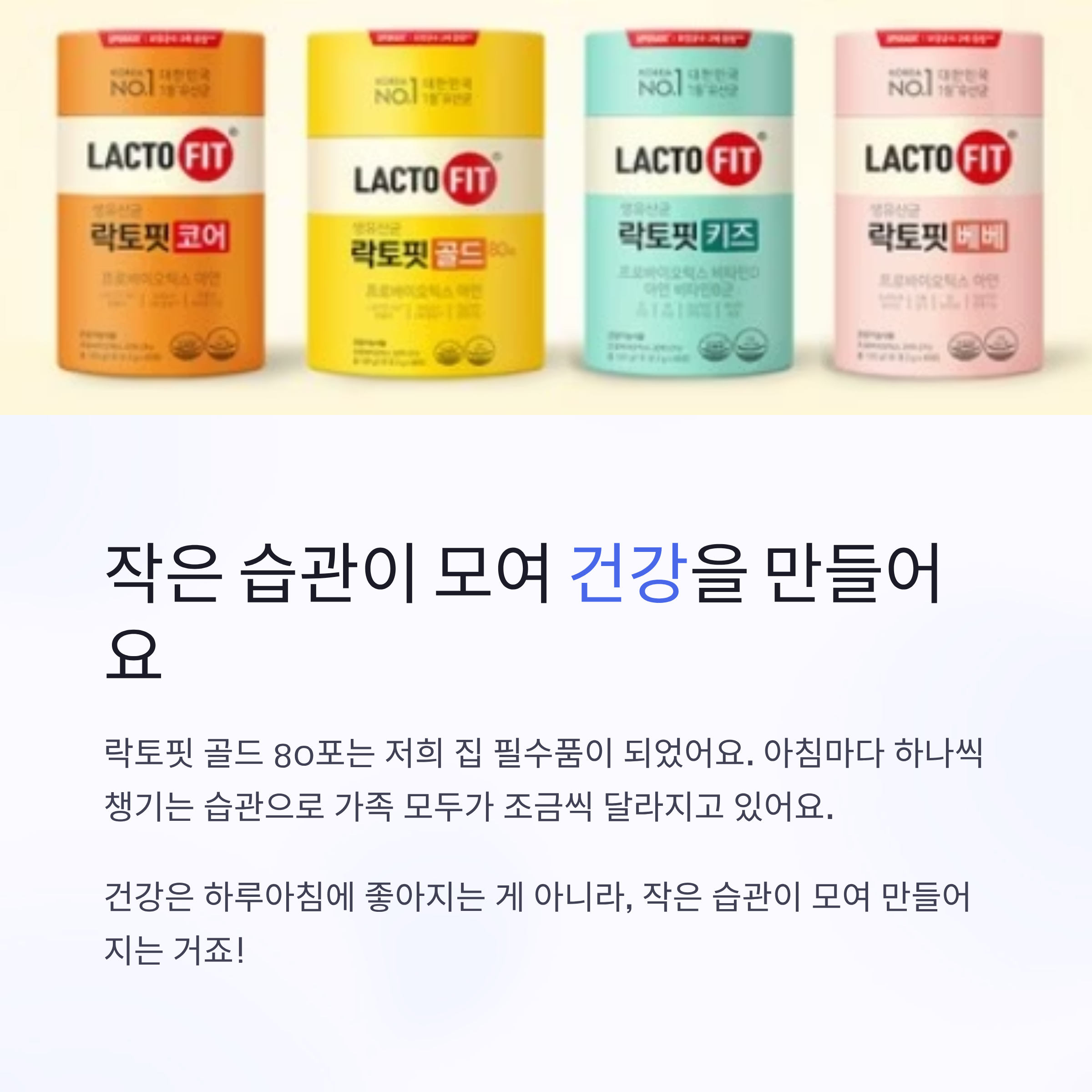 락토핏 골드 80포는 저희 집에서 이제 필수품이 되었어요. 아침마다 하나씩 챙기는 습관이 쌓이면서 가족 모두가 조금씩 달라지고 있다는 게 가장 뿌듯해요.