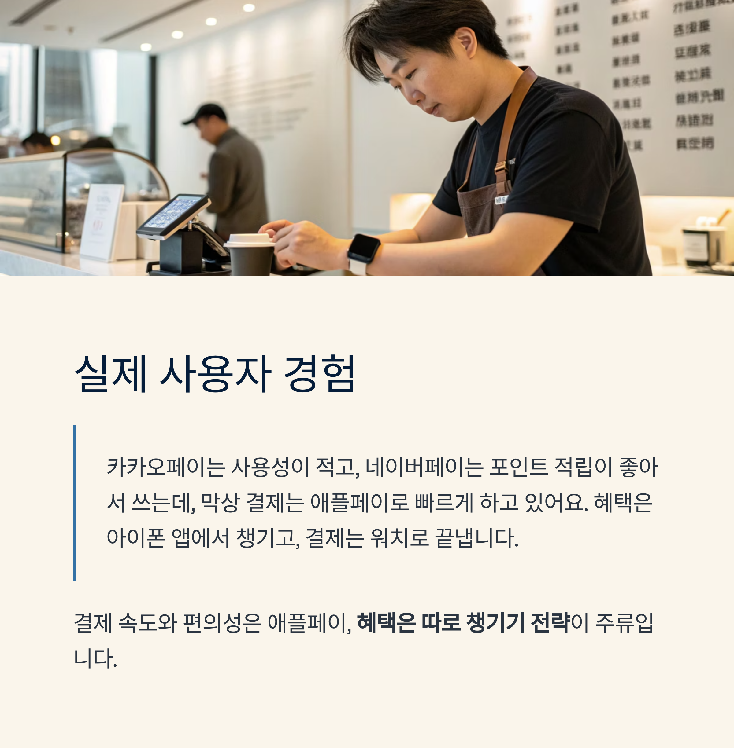 핵심: 결제 속도와 편의성은 애플페이, 혜택은 따로 챙기기 전략이 주류입니다.