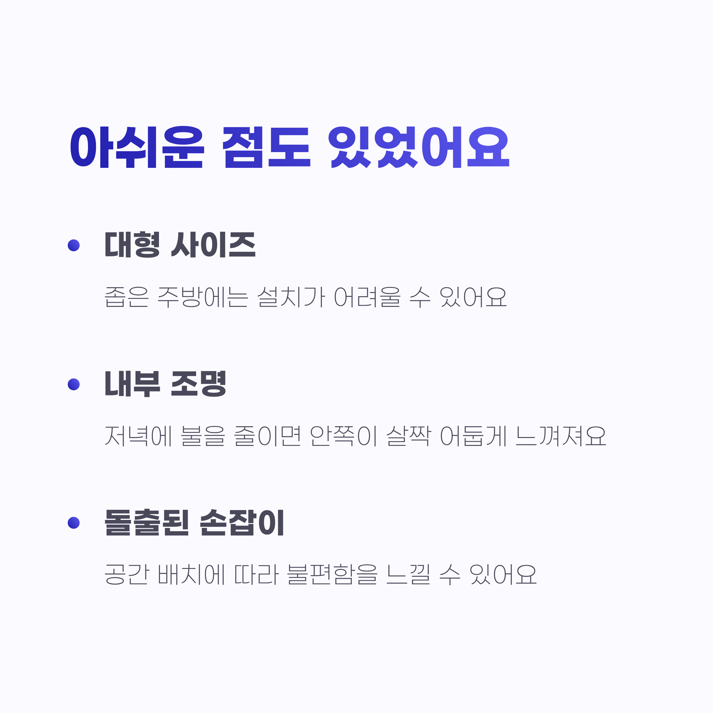 또 한 가지, 문 손잡이 부분이 돌출돼 있어서 공간 배치에 따라 불편함을 느낄 수도 있을 것 같아요. 저희는 측면 공간이 좀 여유 있어서 괜찮았지만, 딱 맞게 들어가는 구조라면 걸리적거릴 수도 있을 것 같더라고요.