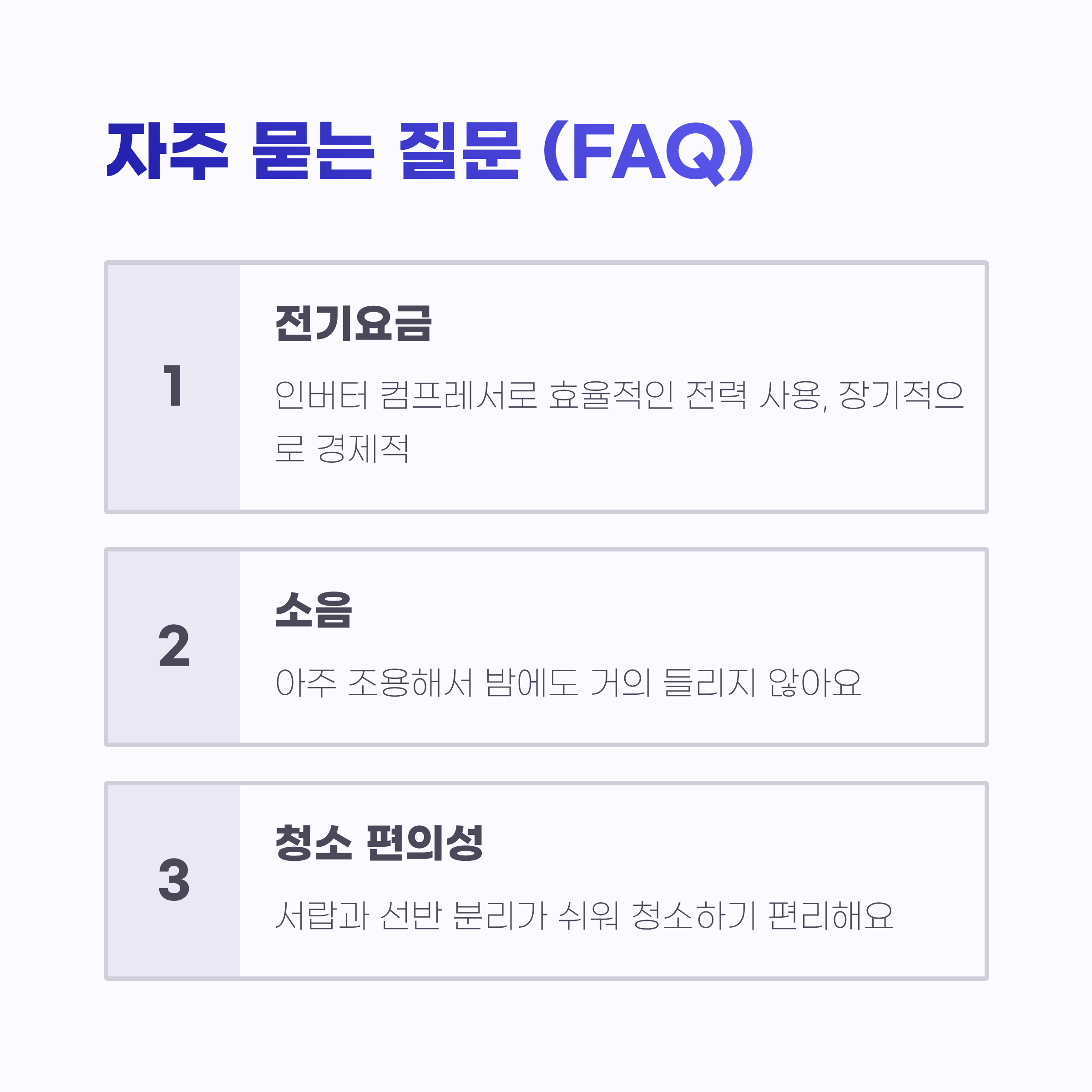 👉 생각보다 전력 소모가 크지 않아요. 오히려 인버터 컴프레서 덕분에 일정한 전력으로 효율적인 냉장을 해줘서 장기적으로 봤을 땐 경제적이에요.