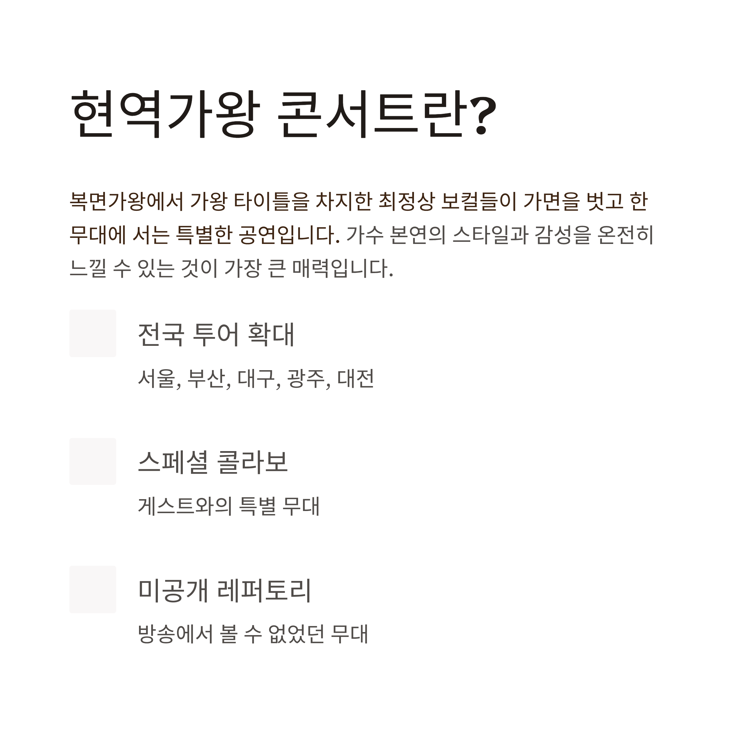 방송 속 무대와 달리 가면을 벗고, 가수 본연의 스타일과 감성을 온전히 느낄 수 있는 것이 가장 큰 매력입니다.