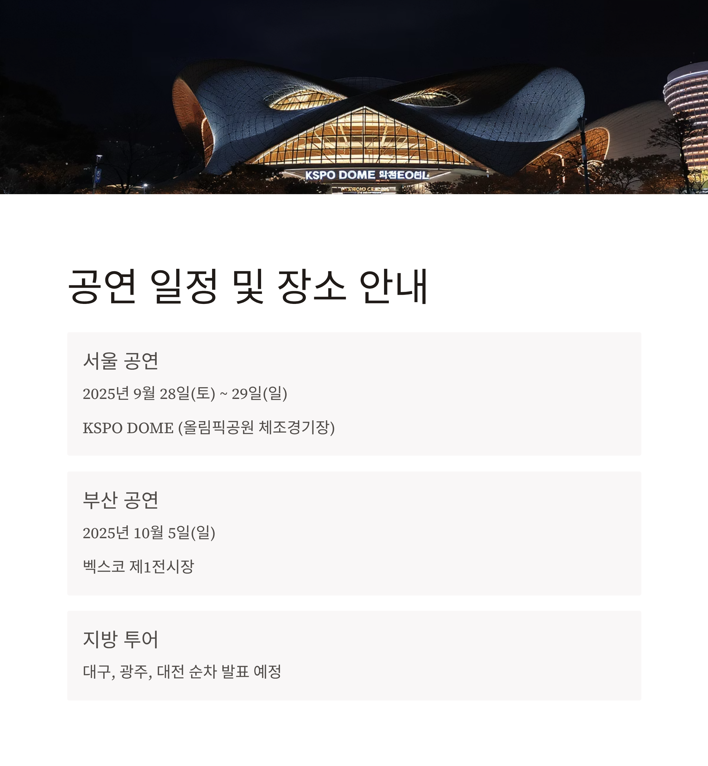 | 서울 공연 | 9월 28~29일 KSPO DOME |