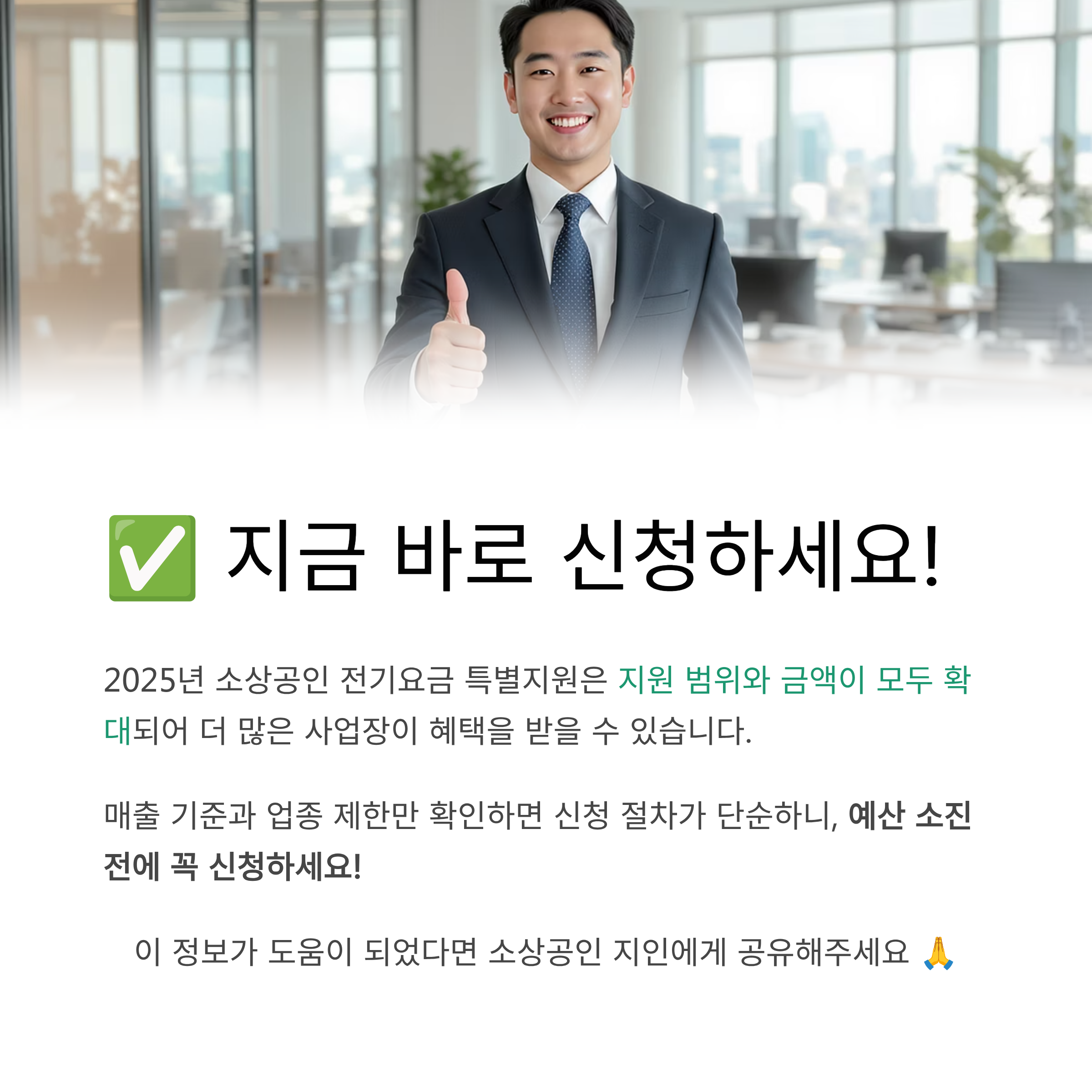 이에 정부는 2025년 ‘소상공인 전기요금 특별지원’을 확대 시행하고 있습니다.