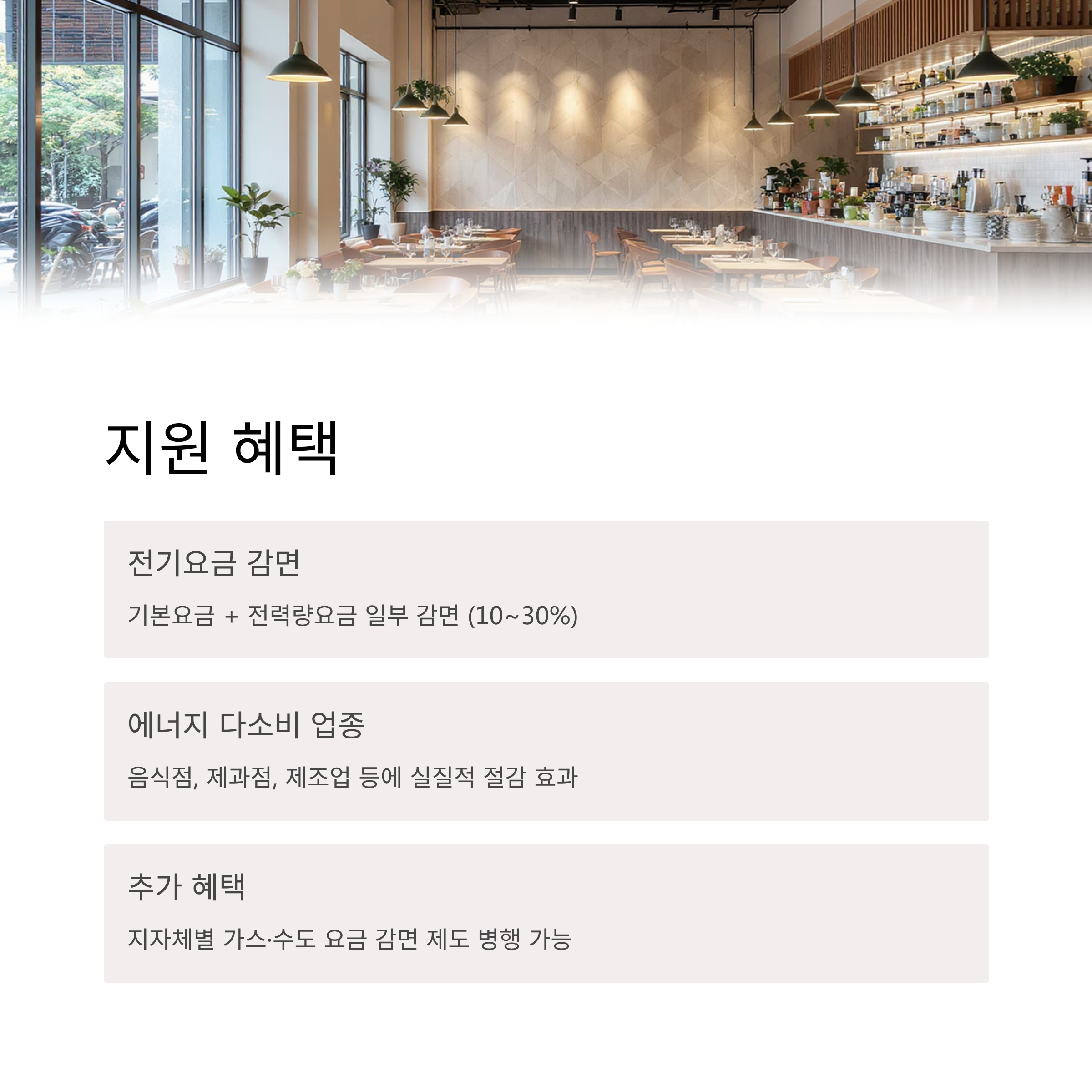 - 에너지 다소비 업종(음식점, 제과점, 제조업 등)에 실질적 절감 효과