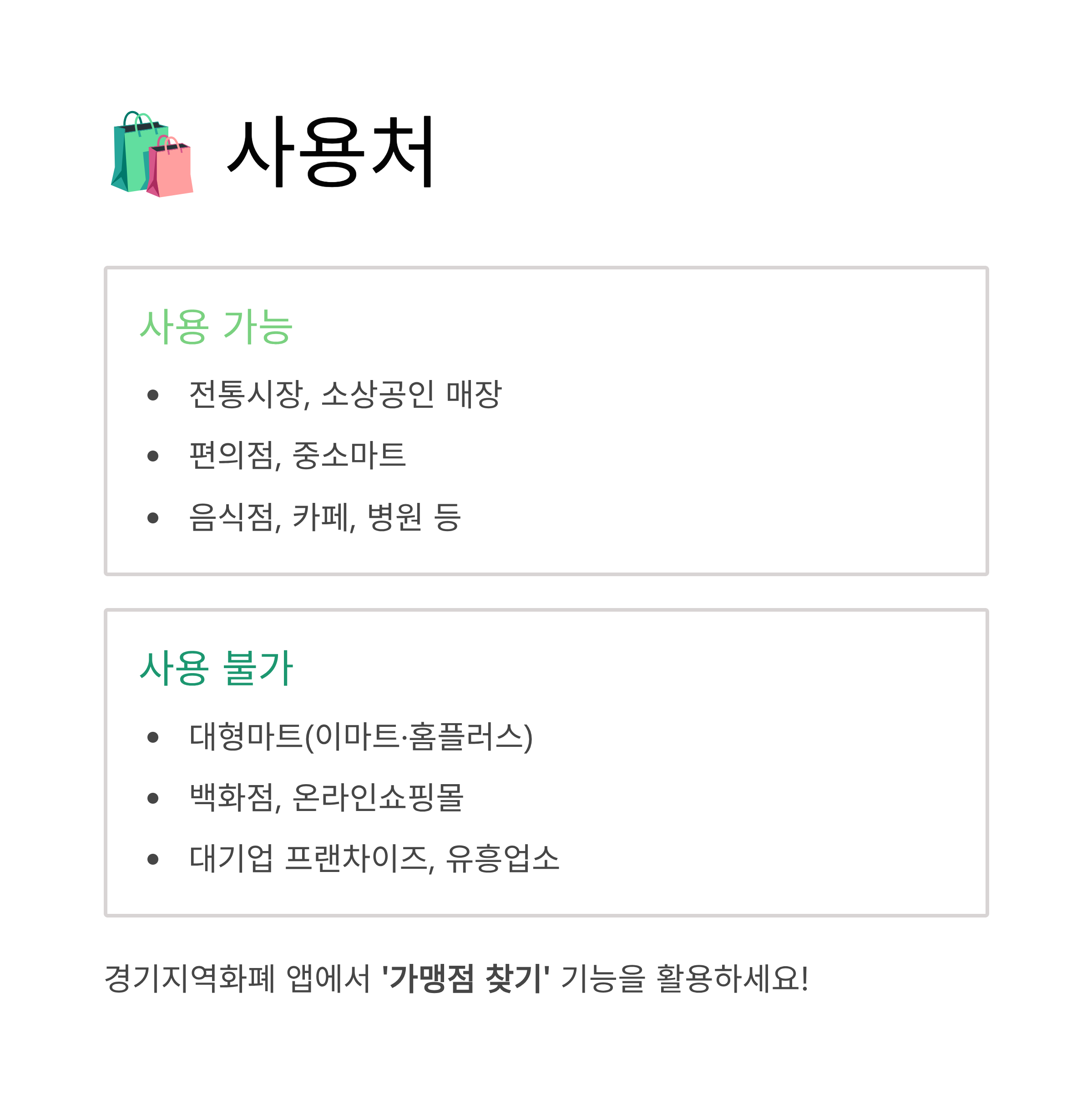 - 불가: 대형마트(이마트·홈플러스), 백화점, 온라인쇼핑몰, 대기업 프랜차이즈, 유흥업소